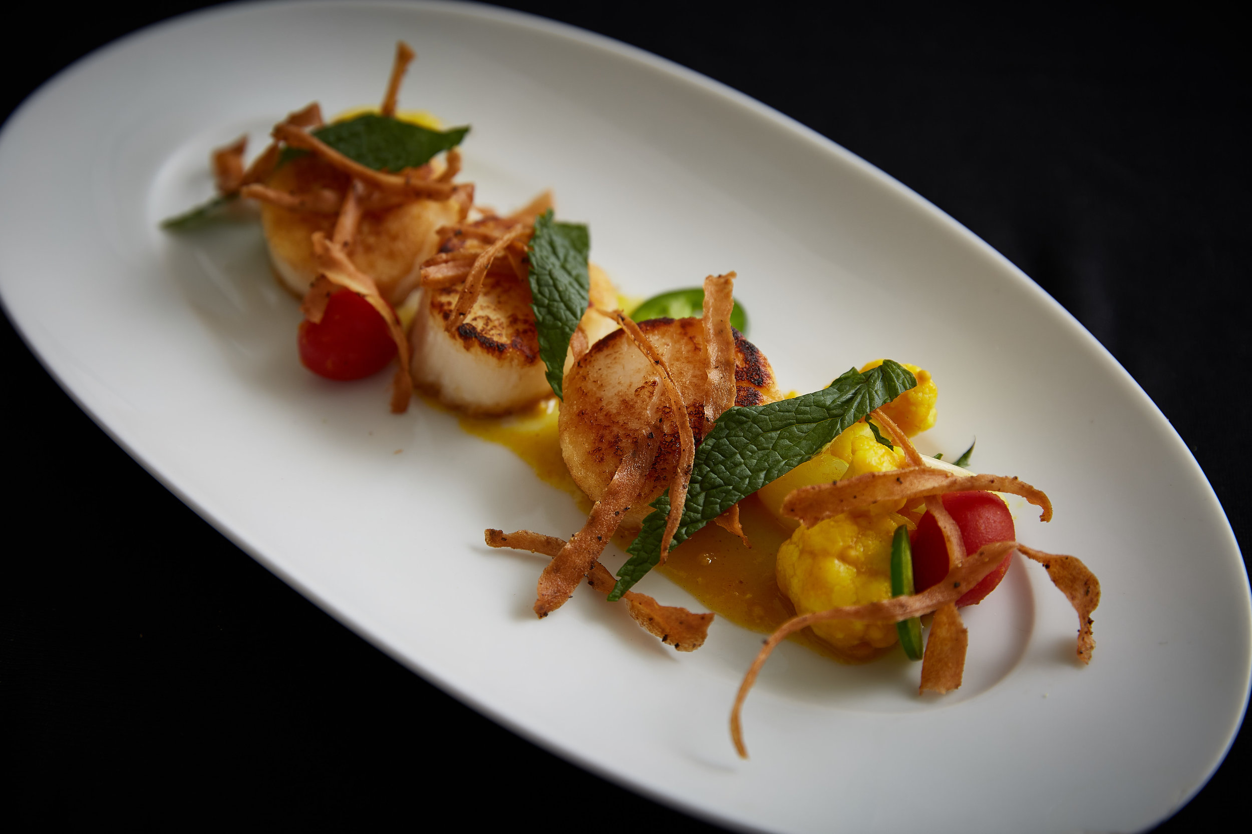 Seared scallops with cauliflower & tomato piccalilli.